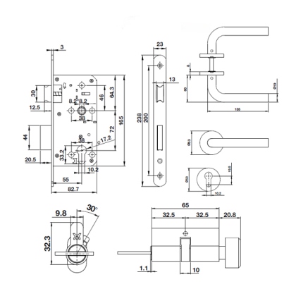 + Thân khóa: mép cửa đến tâm lỗ khóa- backset: 55mm; từ tâm lỗ khóa đến tâm tay gạt (CC): 72mm