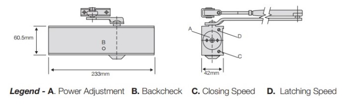 - Lực đẩy (power): size EN 2, 3, 4, 5 (tùy chỉnh lực đẩy theo độ rộng của cửa. EN 2 ≤ 850mm; EN 3 ≤ 950mm; EN 4 ≤ 1100mm; EN 5 ≤ 1250mm)