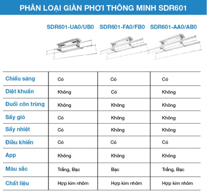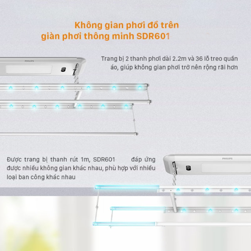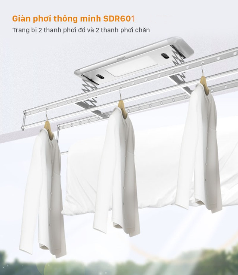 Giàn phơi thông minh Philips SDR601 mang đến nhiều lựa chọn cho các gia đình, khi có 2 loại là loại chỉ công năng cơ bản ( SDR601-AA0/AB0), loại có thêm tính năng sấy khô ( SDR601-UA0/UB0)