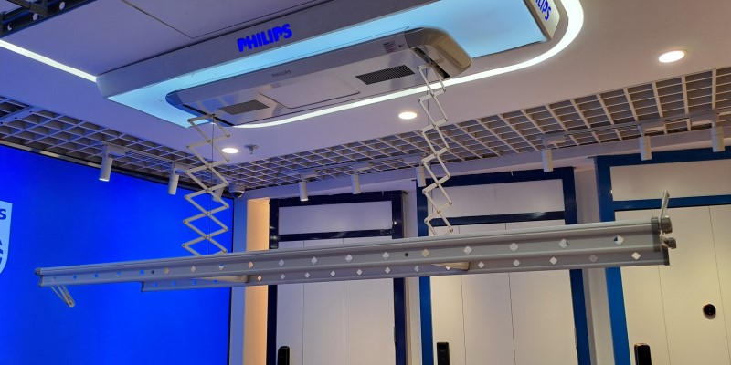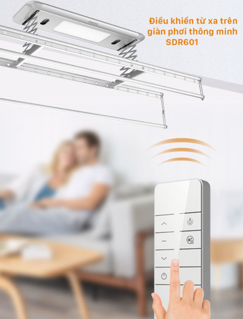 Khác với các dòng giàn phơi sử dụng bộ tời (tay quay), Philips SDR601 tự động hoàn toàn với khả năng điều khiển từ xa thông qua remote. Tất cả các công năng nâng lên, hạ xuống, bật chức năng khử khuẩn,... đều có thể thao tác với chỉ một nút bấm thay vì sử dụng tay quay tốn nhiều sức lực.