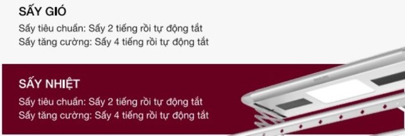 Sấy nhiệt: Sử dụng sức nhiệt 40 - 50 độ C để hong khô quần áo. Công suất 350Wx2, làm khô thần tốc trong thời gian ngắn.