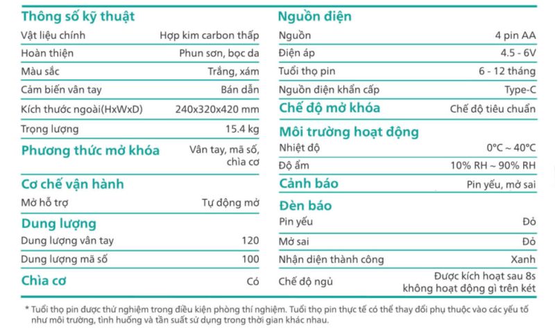 Nguồn điện: 4 viên pin AA alkaline. Thời lượng pin: 6- 12 tháng. Nếu để hết pin, dùng pin dự phòng đấu bên ngoài để mở
