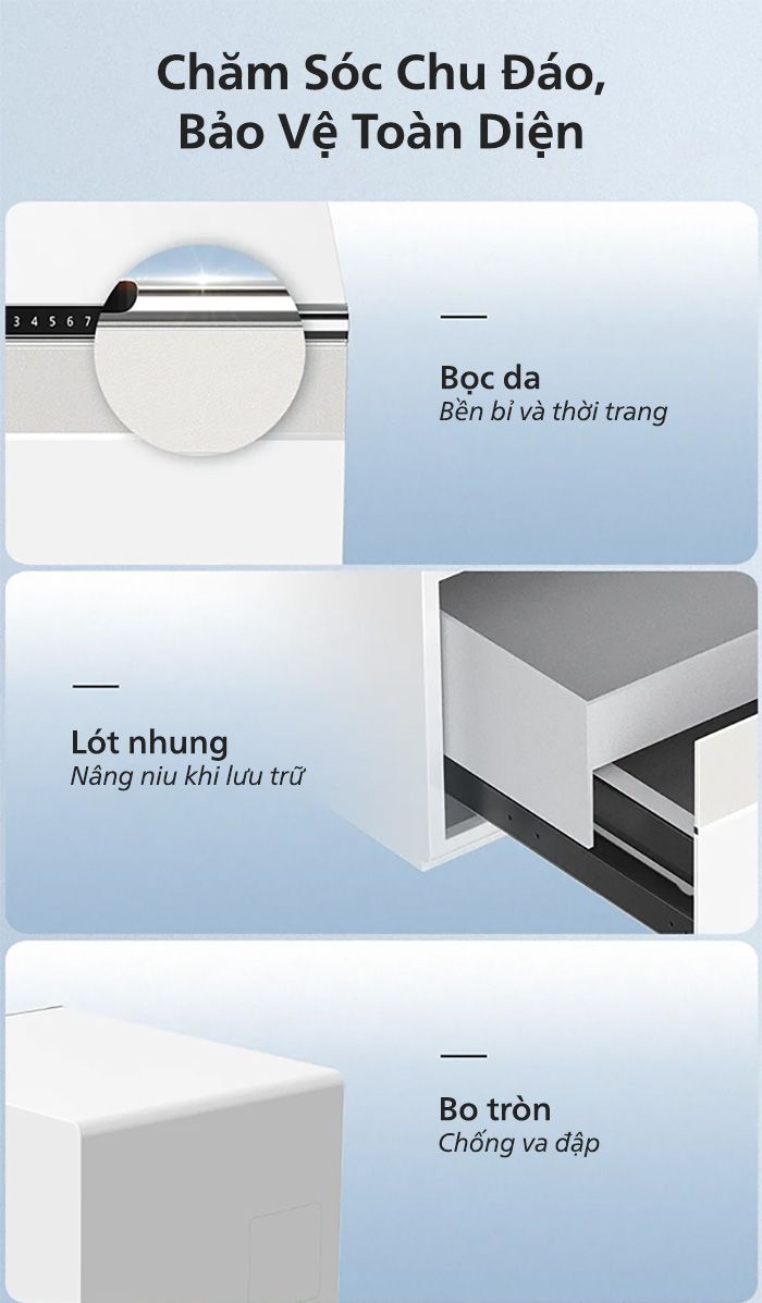 Các chất liệu bổ trợ như bọc da bên ngoài và lót nhung bên trong ngăn kéo giúp bảo vệ két sắt khỏi trầy xước do va chạm hoặc bám bụi bẩn. Chúng cũng góp phần khiến thiết kế của két trở nên hoàn diện và sang trọng hơn khi trưng bày.