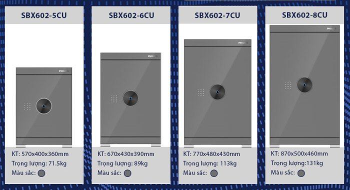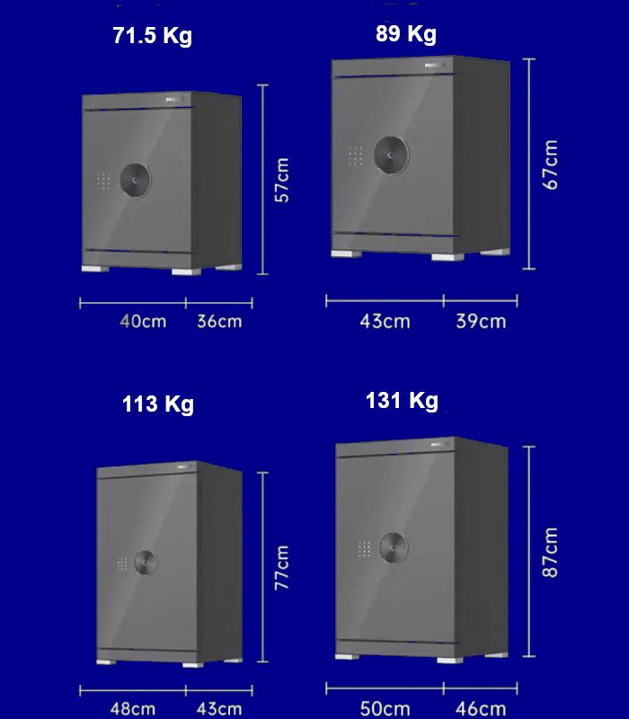 Hiện tại, két sắt điện tử Philips SBX602 đang có 4 hạng cân tùy chọn: 71.5kg, 89kg, 113kg và 131kg. Các hạng cân phù hợp với đa dạng mục đích sử dụng và kiến trúc, kích thước không gian lắp đặt khác nhau