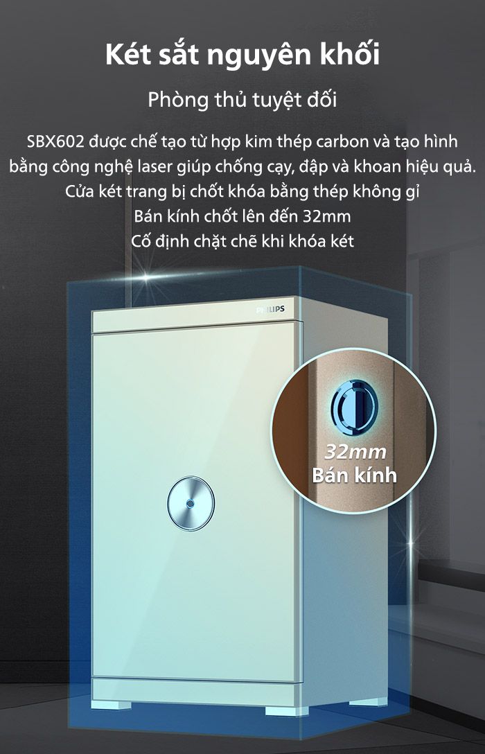 Két sắt Philips SBX602 có thiết kế hiện đại, trang bị nhiều công nghệ bảo mật cao cấp như mở khóa vân tay và kết nối với điện thoại qua internet để theo dõi an ninh