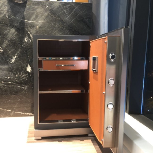Ngay khi mở két, người dùng sẽ được chiêm ngưỡng hệ thống nội thất bọc da PU chắc chắn. Phần bọc da này được hoàn thiện vô cùng tỉ mỉ và chắc chắn, đi cùng với viền kim loại sáng bóng, cao cấp