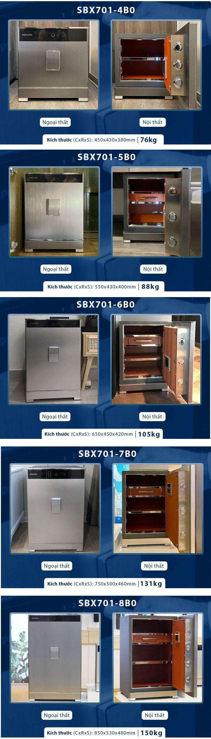 Két sắt Philips SBX701 có 5 hạng cân: 76kg, 88kg, 105kg, 131kg, 150kg. Chúng phù hợp với đa dạng mục đích sử dụng. Đặc biệt, với mẫu két cân nặng từ 88kg trở lên, người dùng còn được trang bị thêm ngăn kéo để cất giữ đồ trang sức quý giá vô cùng tiện lợi.