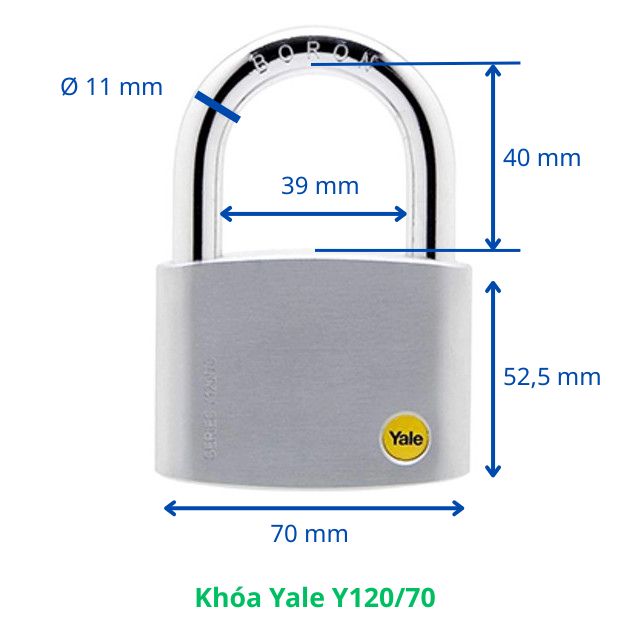 - Kích thước thân khóa: rộng 70 x cao 52,5 x dầy 20 mm. Khoảng trống bên trong càng khóa: rộng 39 mm, cao 40 mm. Đường kính càng khóa: 11 mm