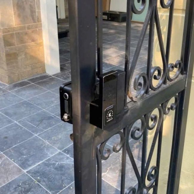 Đây là loại khóa cổng vân tay 2 chiều, tức để mở khóa từ bên trong cũng cần dùng các phương mở khóa như ở bên ngoài: vân tay, thẻ từ, mã số, chìa cơ, mobile hoặc remote, nên rất phù hợp làm khóa cho cổng nan thưa hay để đảm bảo kẻ trộm có nhảy vào trong sân cũng không mở được khóa cổng