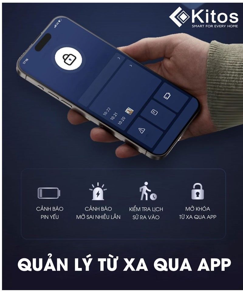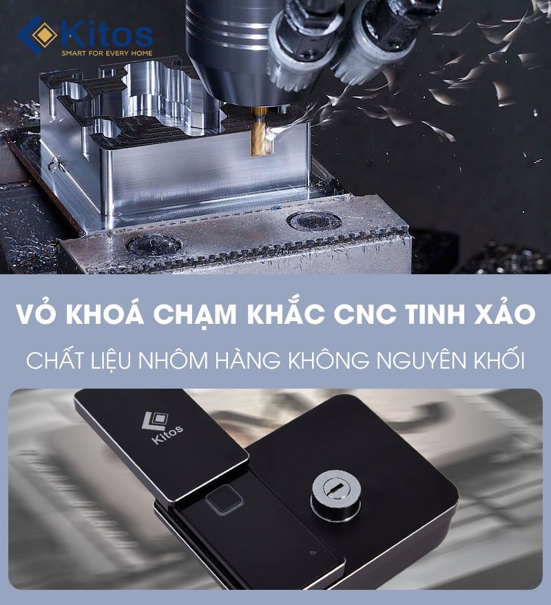 - Khóa Kitos DLS8 CNC đăng ký tối đa được 100 vân tay, 50 thẻ từ, 50 mã số. Có sẵn: 2 thẻ từ nhỏ, 2 chìa cơ. Có thể mua thêm remote để đóng mở từ xa
