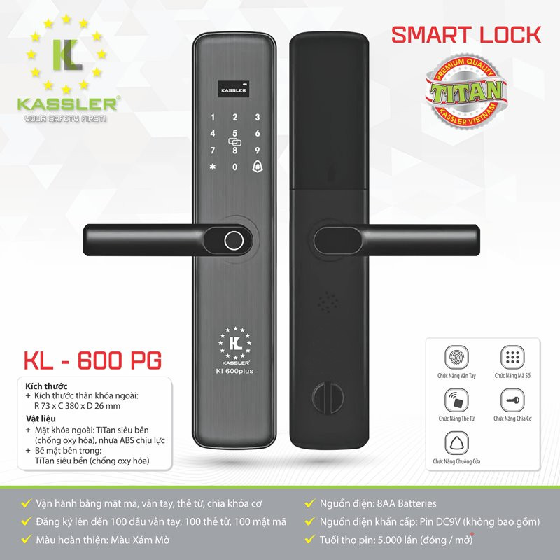 Với phiên bản tiêu chuẩn, khóa Kassler KL-600 PG có mở bằng: vân tay, mã số, thẻ từ, chìa cơ. Hãng áp dụng công nghệ vân tay hiện đại, rất nhạy và chống vân tay giả