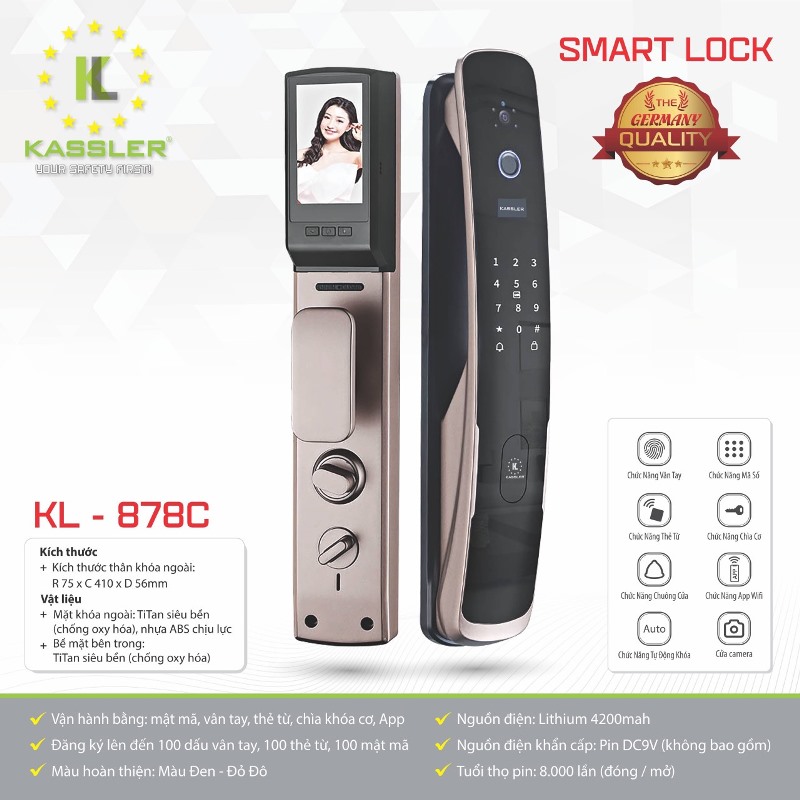 Khóa Kassler KL-878C có mở khóa bằng: vân tay, thẻ từ, mã số, chìa cơ, mobile app. Hãng sử dụng công nghệ vân tay hiện đại có độ bảo mật rất cao
