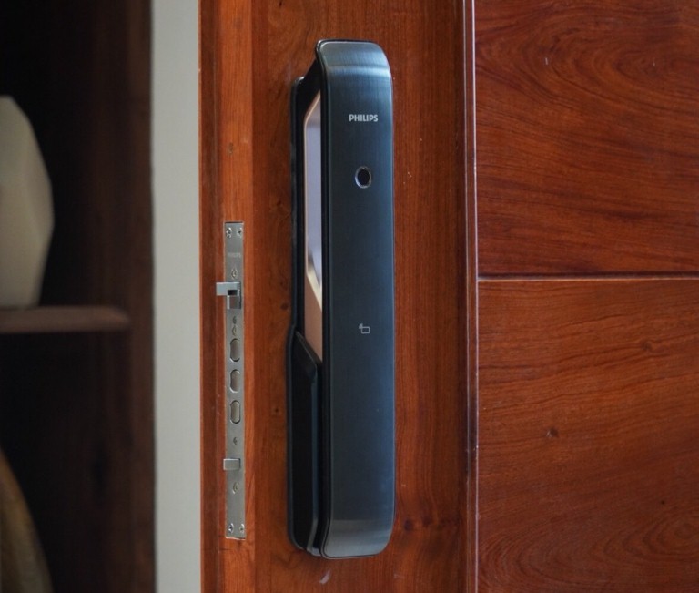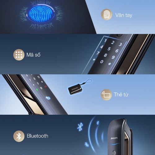 - Mở khóa bằng: vân tay, thẻ từ, mã số, chìa cơ, bluetooth. Có thể mua thêm Philips gateway để đóng/ mở và quản lý khóa từ bất kì đâu trên thế giới qua wifi/ 4G. Thêm điều khiển từ xa (remote) nếu cần