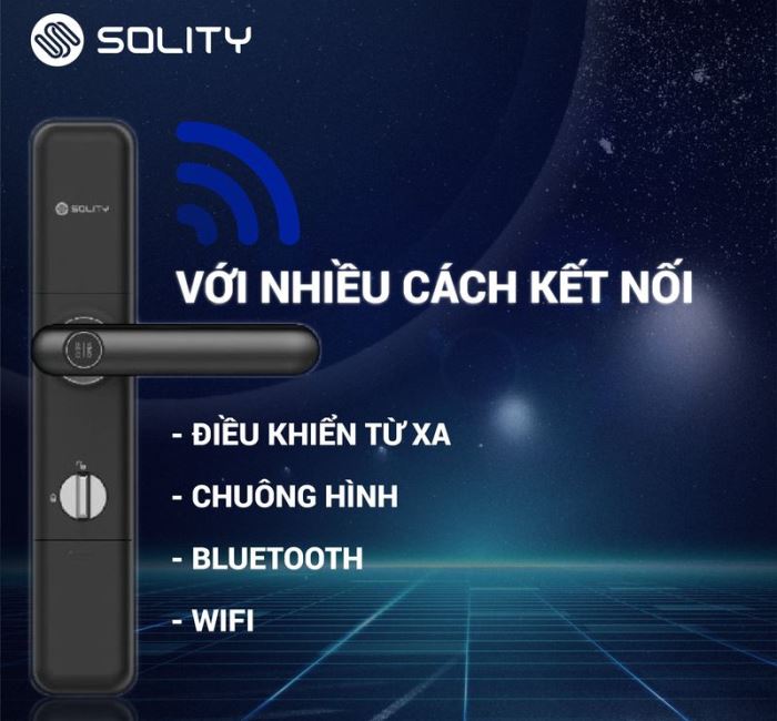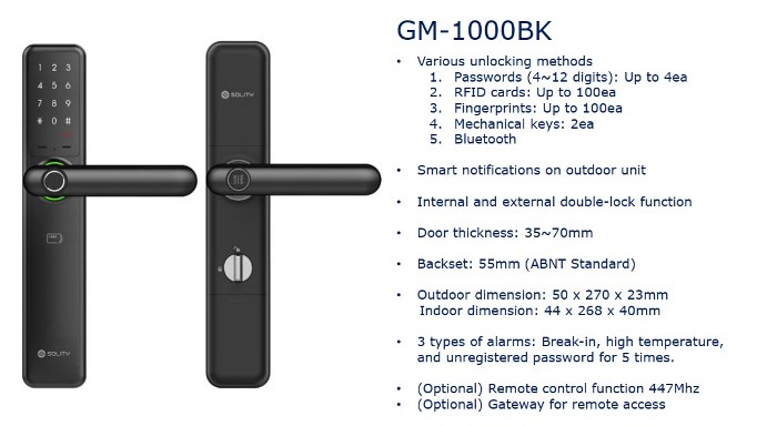- Solity GM-1000BK có mở khóa bằng vân tay, thẻ từ, mã số, chìa cơ, app mobile qua bluetooth. Nếu cần người dùng có thể mua thêm phụ kiện gateway để mở và quản lý khóa từ xa qua wifi/ 4G. Bên cạnh đó, khóa cũng có đầy đủ tính năng an toàn khác như: mã số ảo giúp tránh bị lộ mật khẩu, báo cháy khi nhiệt độ trong nhà cao ( báo động và tự mở khóa), cảnh báo khi có hiện tượng phá khóa, cũng như tính năng khi cần ngăn trẻ em mở khóa ra ngoài