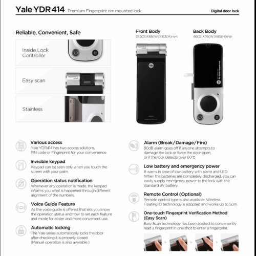YDR414 cùng với YDD424 là số rất ít các loại khóa điện tử không tay nắm có thêm chức năng mở bằng chìa cơ. Thân trong và thân ngoài đều lắp thẳng đứng