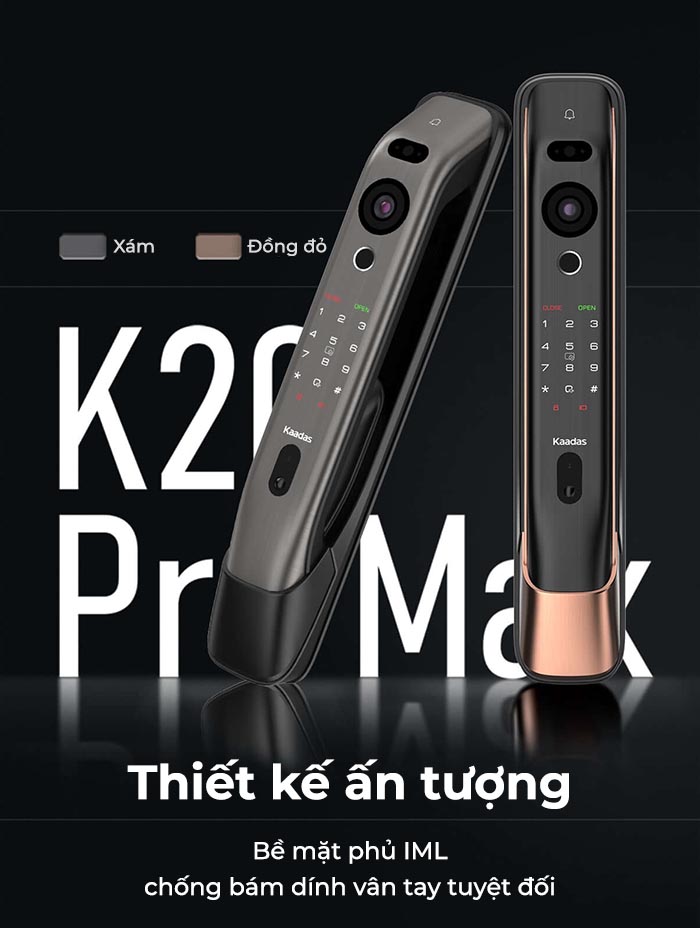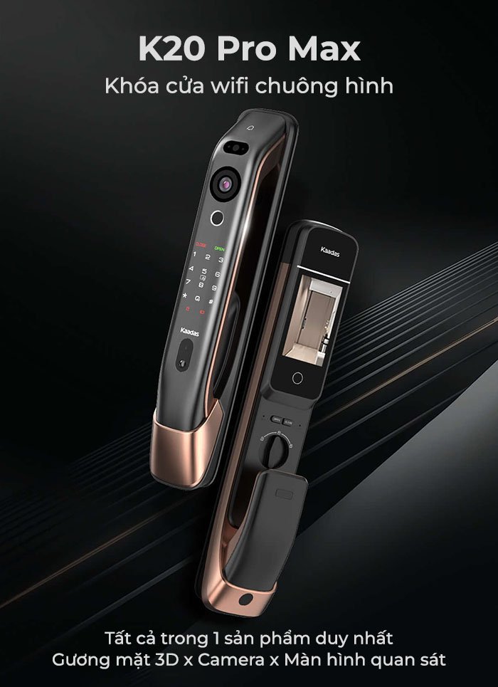 Kaadas K20 Pro Max mang đến sự đột phá khi tích hợp chuông hình, đẩy cuộc gọi video về điện thoại ngay khi có khách bấm chuông. Siêu phẩm còn được trang bị công nghệ nhận diện gương mặt 3D tiên tiến. Mở khoá cửa không chạm ngay cả trong bóng đêm, khi đeo kính và khi đội mũ. Không chỉ là một chiếc khoá cửa thông minh, mẫu khóa này còn có thiết kế sang trọng và tinh tế, tạo điểm nhấn thêm cho ngôi nhà của bạn
