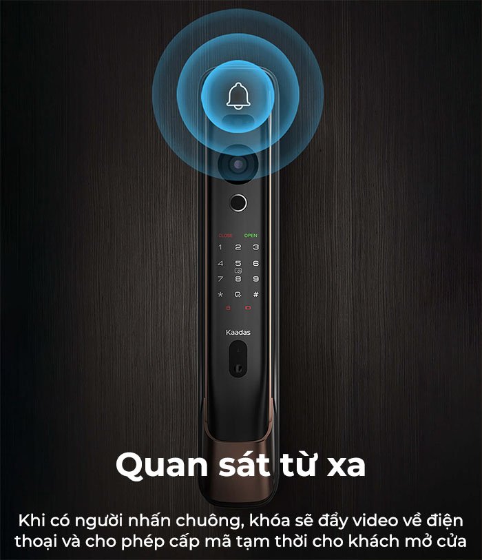 Kaadas K20 Pro Max trang bị tính năng kết nối wifi vô cùng hữu ích và tiện lợi. Với tính năng này, bạn có thể tận dụng những tiện ích sau đây: kiểm tra lịch sử đóng mở cửa, nhận thông báo về việc đóng mở cửa, và dễ dàng chia sẻ mã số mở cửa tạm thời từ xa với người người thân, bạn bè khi vắng nhà.