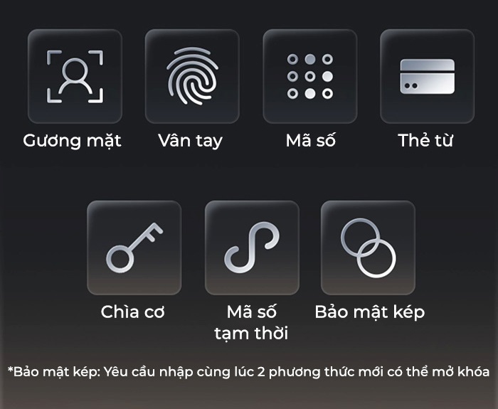 - Mở bằng: gương mặt, vân tay, thẻ từ, mã số, chìa cơ, mobile app wifi