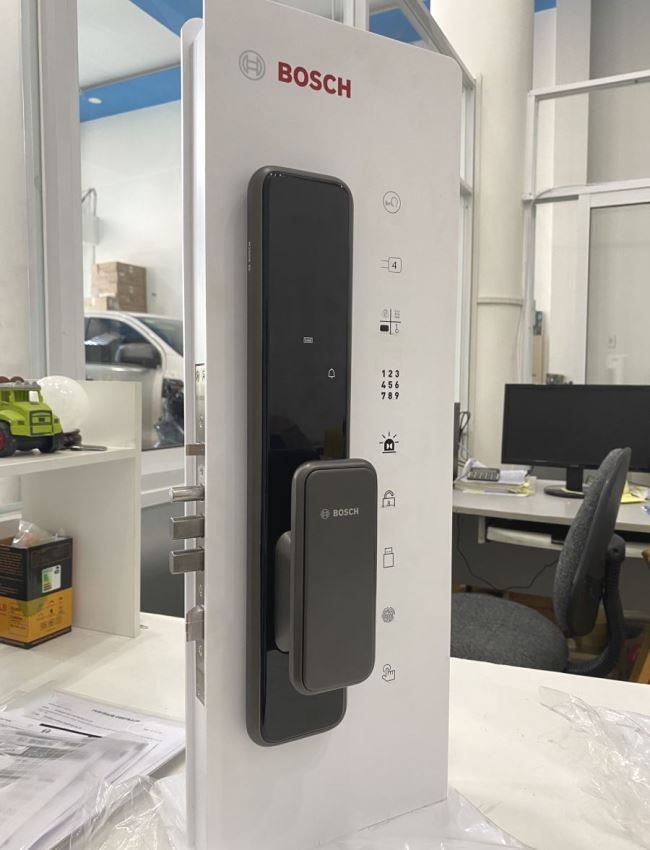 - Khoá Bosch EL 600B màu đen xám đăng ký tối đa được 20 khuôn mặt, 100 vân tay, 100 thẻ từ, 100 mã số người dùng (có mã số chủ để quản lý người dùng), 10 mã số khách. Có sẵn: 2 thẻ từ nhỏ, 2 chìa cơ. Thẻ từ NFC có thể tích hợp lên điện thoại để dùng, mà không cần mang thẻ theo người
