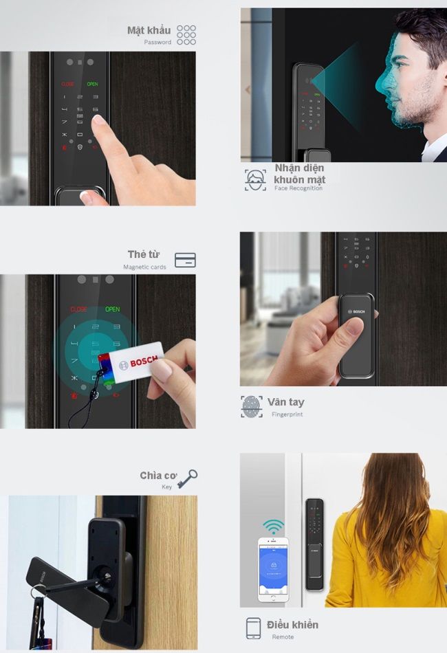 - Mở bằng: khuôn mặt, vân tay, thẻ từ, mã số, chìa cơ, app wifi