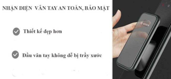 - Bosch EL600B App màu đen xám đăng ký tối đa được 20 khuôn mặt, 100 vân tay, 100 thẻ từ, 100 mã số người dùng (có mã số chủ để quản lý người dùng), 10 mã số khách. Có sẵn: 2 thẻ từ nhỏ, 2 chìa cơ. Thẻ từ NFC có thể tích hợp lên điện thoại để dùng, mà không cần mang thẻ theo người