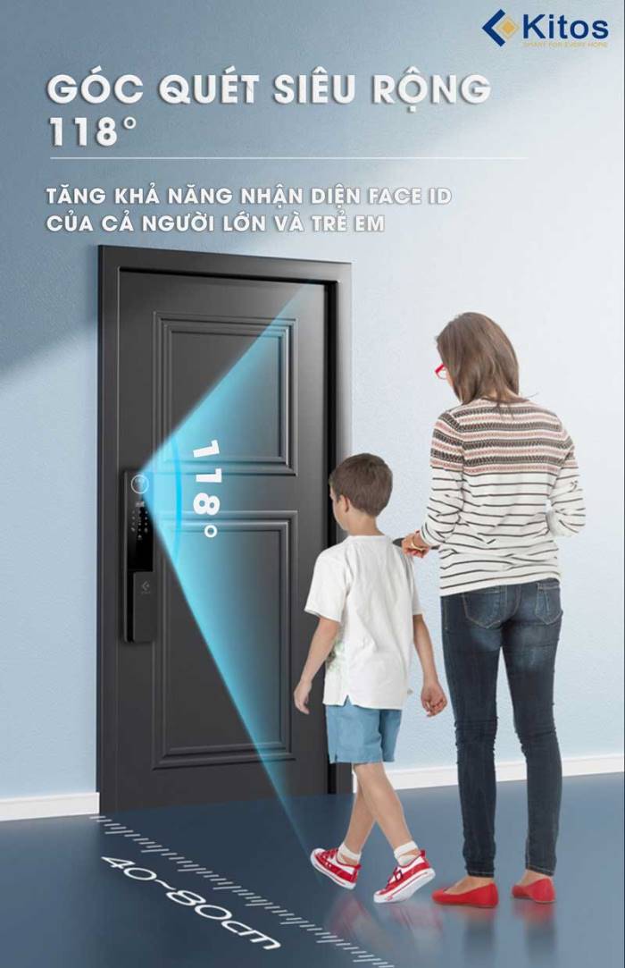 Góc quét của Kitos KT X8 Face Id lên đến 118 độ, tăng khả năng nhận diện với các chiều cao khác nhau giúp cho trẻ em cũng dễ dàng sử dụng.