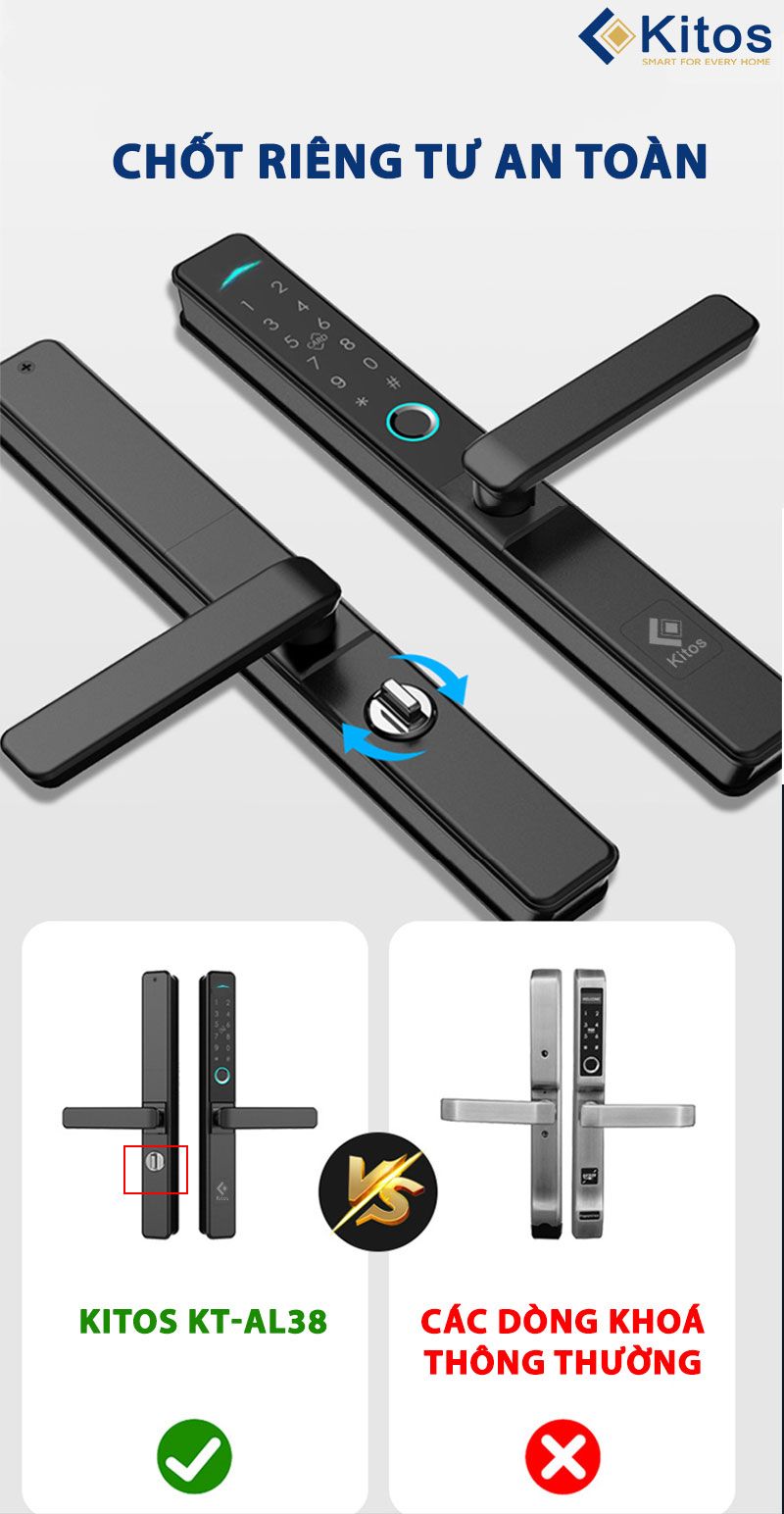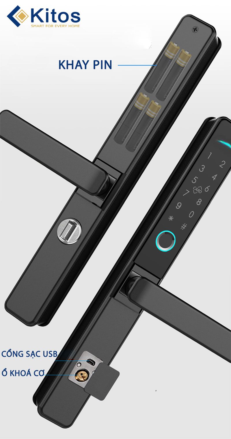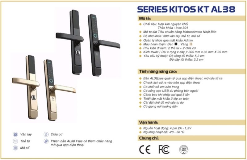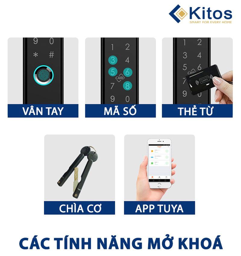 Kitos KT-AL38 Plus có các phương thức mở khóa: vân tay, thẻ từ, mã số, chìa cơ, và app mobile qua wifi. Với app mobile, gia chủ có thể mở khóa từ xa, xem lịch sử ra vào của thành viên gia đình ngay trên điện thoại