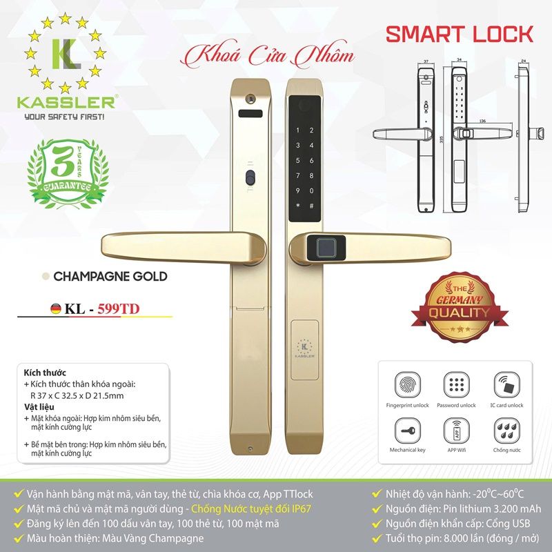 Kassler KL-599TD champagne gold có mở bằng: vân tay, mã số, thẻ từ, chìa khóa chống sao chép, và mobile app TTLock.