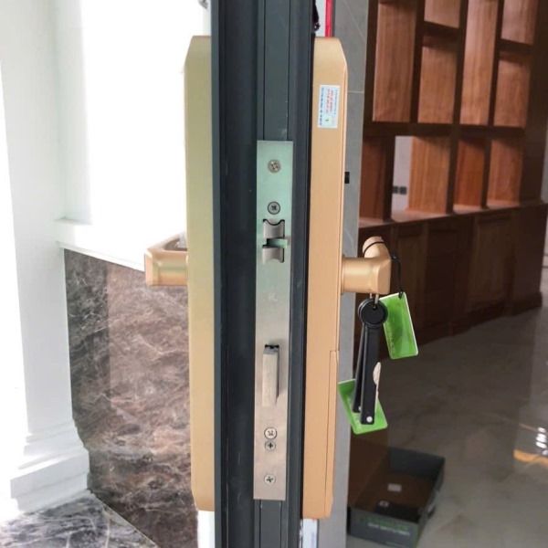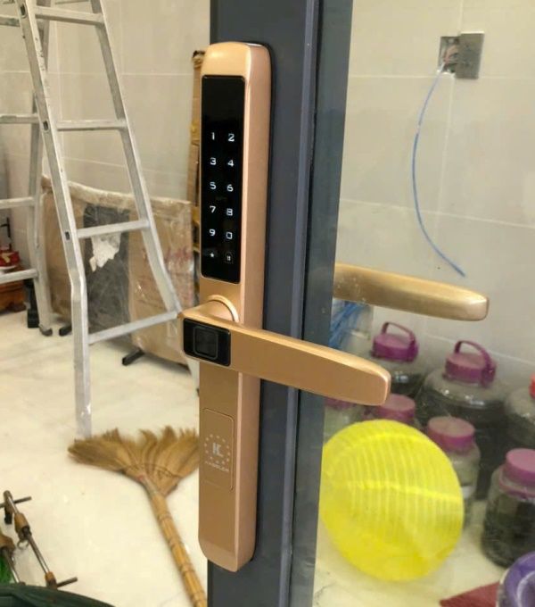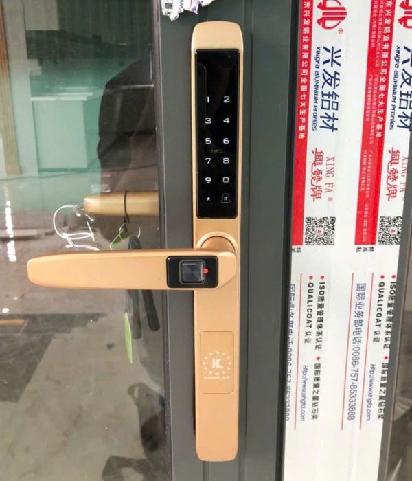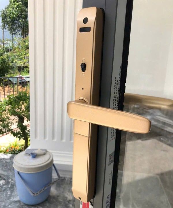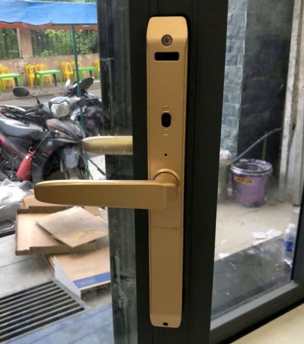 Khóa điện tử cửa nhôm, có mở bằng điện thoại. Chống chịu được nước mưa. Màu vàng sâm panh