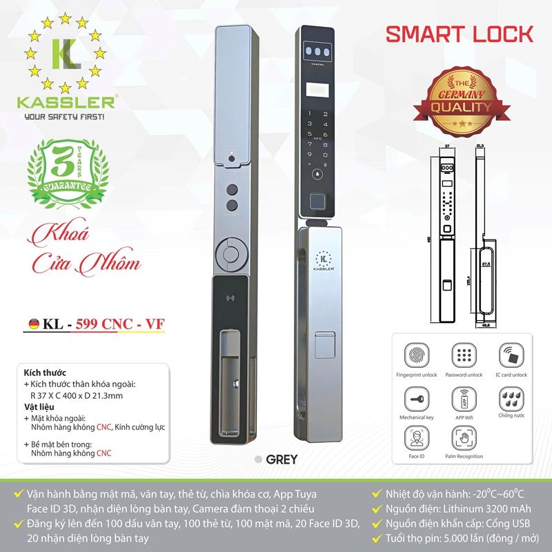 Khóa Kassler KL-599 CNC VF Grey có mở bằng: khuôn mặt face ID, vân tay, lòng bàn tay, mã số, thẻ từ, chìa khóa chống sao chép, mobile app wifi Tuya