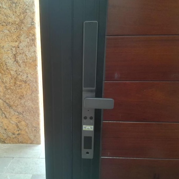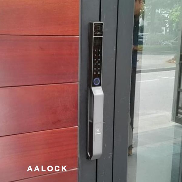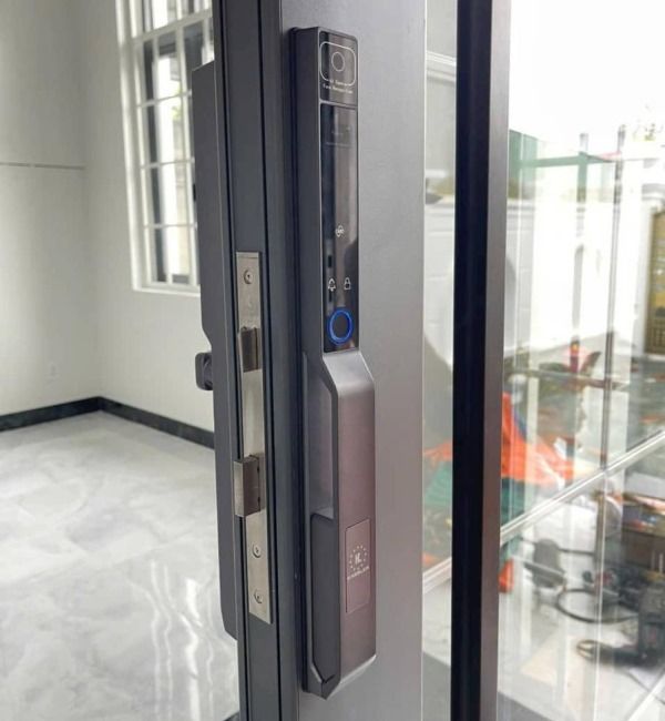 Khóa cửa nhôm kính nhận diện khuôn mặt có mở từ xa bằng điện thoại. Thân khóa ngoài chịu được nước mưa