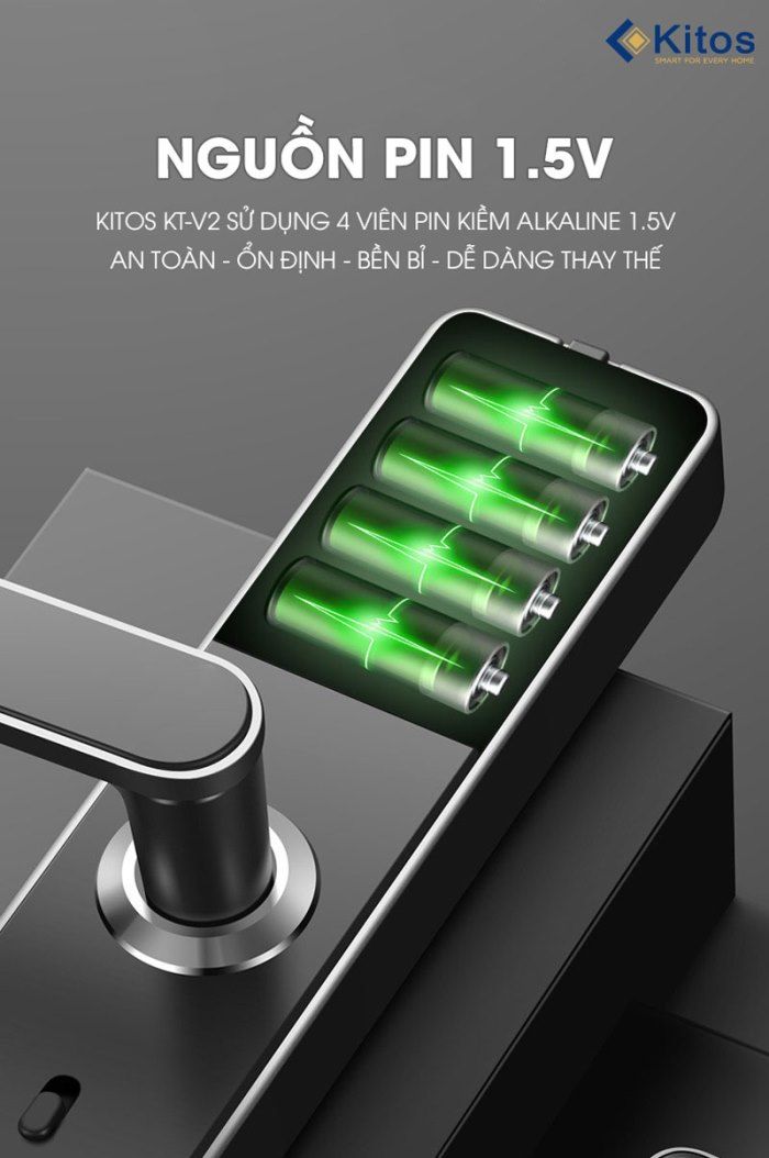 Kitos KT V2 Pro sử dụng nguồn 4 viên pin AA, thời gian hoạt động trung bình từ 6 tháng đến 12 tháng tùy theo tần suất sử dụng. Khi hết pin dễ dàng thay thế bằng cách tháo nắp sau và thay pin mới