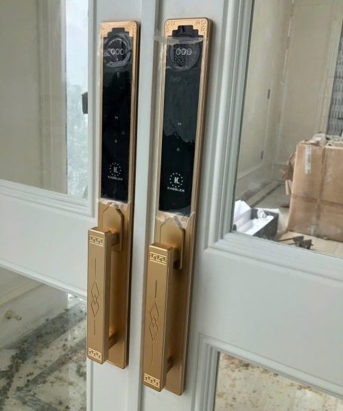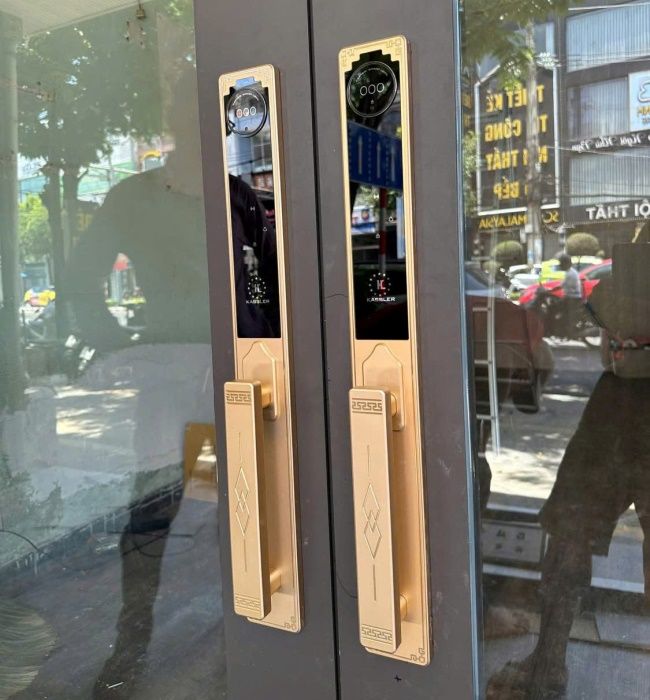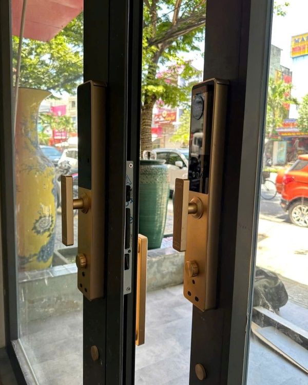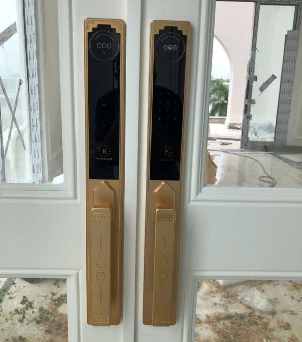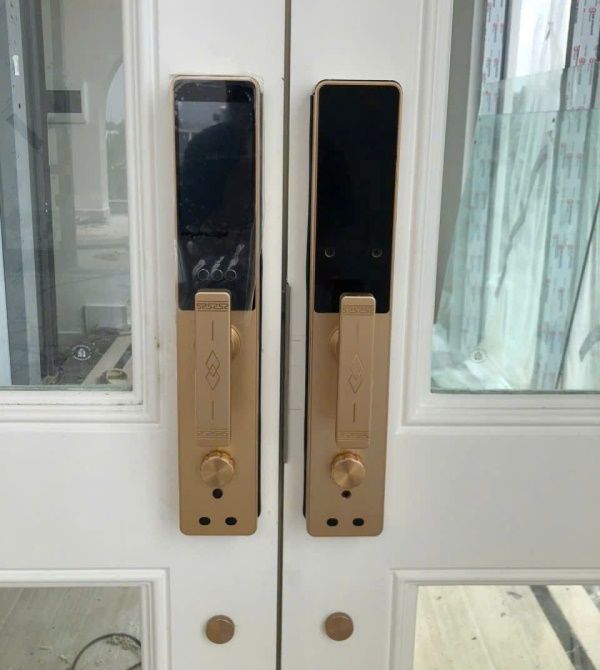 Khoá cửa nhận diện khuôn mặt cho cửa đại sảnh. Giá trọn bộ gồm 2 khóa lắp 2 bên cánh cửa. Có camera cho chuông hình và kết nối tới mobile để đàm thoại từ xa với khách. Màu vàng