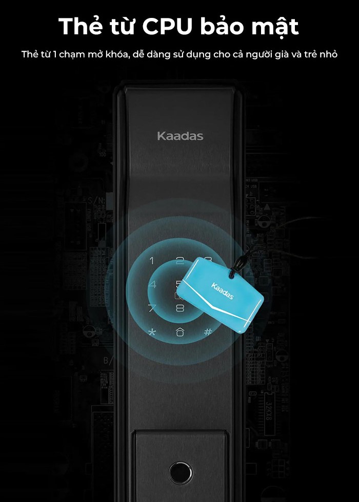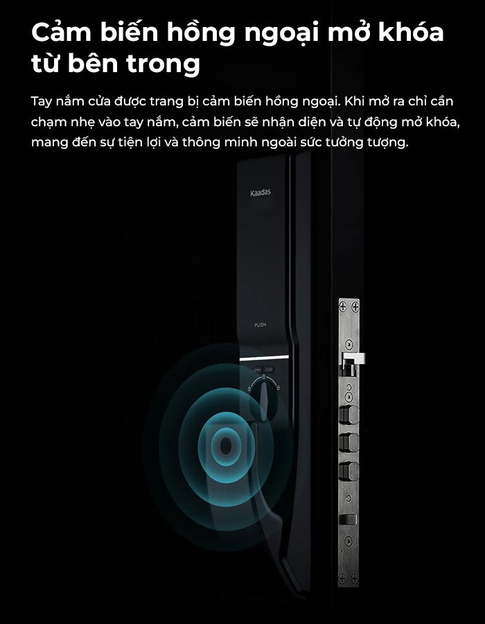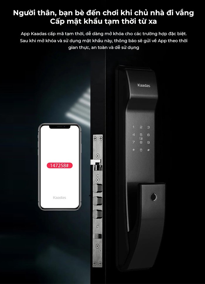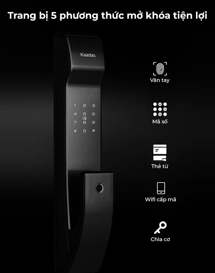 - Kaadas K9-5W có mở khóa bằng: vân tay, thẻ từ, mã số, chìa cơ, app wifi. Có thể mua thêm phụ kiện để mở bằng điều khiển từ xa (remote)