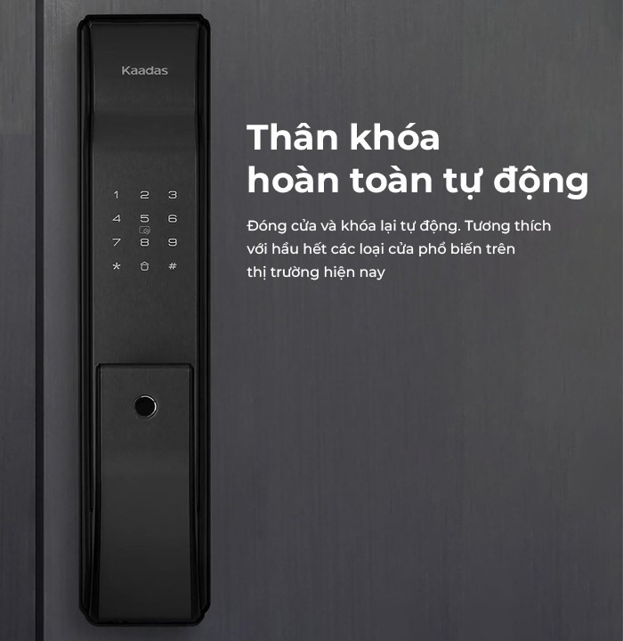 Kaadas K9-5W sở hữu thân khóa tự động. Cửa nhà tự động được khóa lại sau khi đóng, đồng thời gửi cảnh báo nếu cửa được đóng chưa đúng cách. Không chỉ tiện lợi, mà K9-5W có thể dễ dàng thay thế ổ khóa cũ của gia đình bạn trên nhiều chất liệu và kích thước cửa khác nhau. Cửa chung cư, công ty, văn phòng hay shophouse,... đều có thể lắp đặt khóa với khả năng tương thích lên đến 99%.