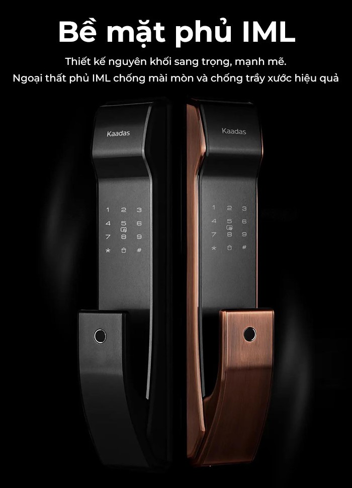 K9-5W có 2 màu sắc là đen và đồng đỏ trang nhã sẽ phù hợp với mọi không gian sống của gia đình. Bề mặt khóa phủ IML giúp chống mài mòn, chống xước, chống bám bụi, không để lại dấu vân tay, giữ gìn ngoại quan và màu sắc của khóa luôn sáng mới.