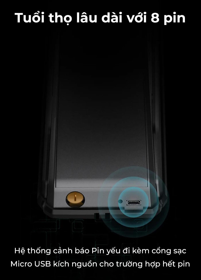Kaadas K9-5W sử dụng 8 Pin Alkaline cho tuổi thọ sử dụng lâu dài. Thiết kế cổng sạc Micro USB ngay trên thân khóa dễ dàng sử dụng. Đây là cổng để cắm bộ kích nguồn cho trường hợp khẩn cấp, ví dụ như khi khóa hết pin.
