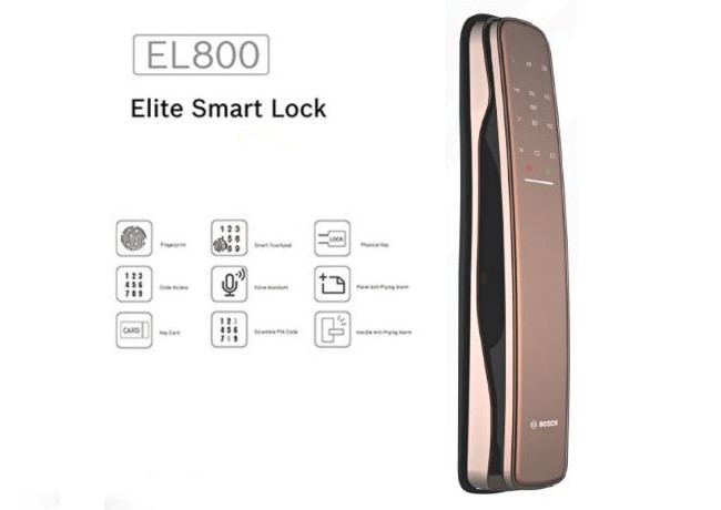 - Khoá Bosch EL 800A màu vàng đăng ký tối đa được 100 vân tay, 100 thẻ từ, 100 mã số người dùng (có mã số chủ để quản lý người dùng), 10 mã số khách. Có sẵn: 2 thẻ từ nhỏ, 2 chìa cơ