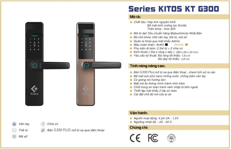 - Kitos KT-G300 đăng ký tối đa được 300 vân tay, thẻ từ, mã số. Có sẵn: 2 thẻ từ nhỏ, 2 chìa cơ. Mua thêm remote nếu cần