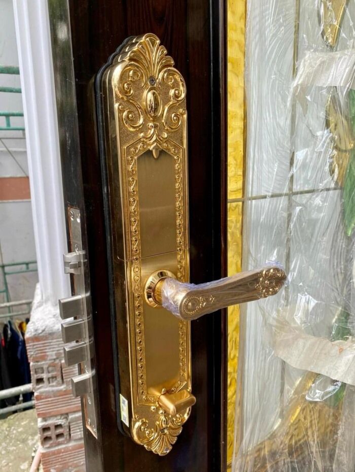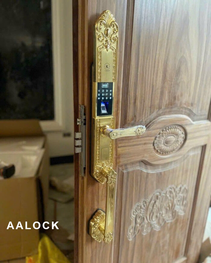 Khóa làm hợp kim kẽm mạ vàng 18K. Có bản thường và bản có thêm mở từ xa bằng điện thoại
