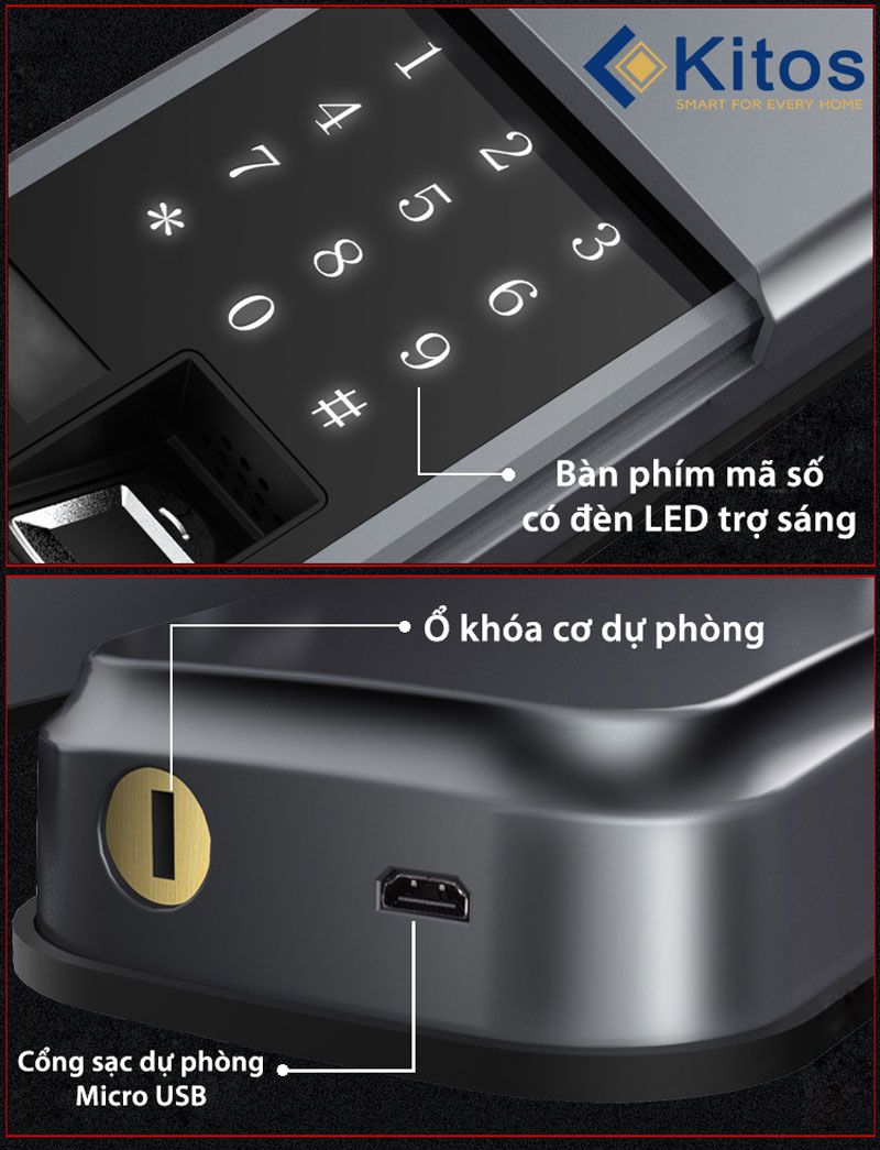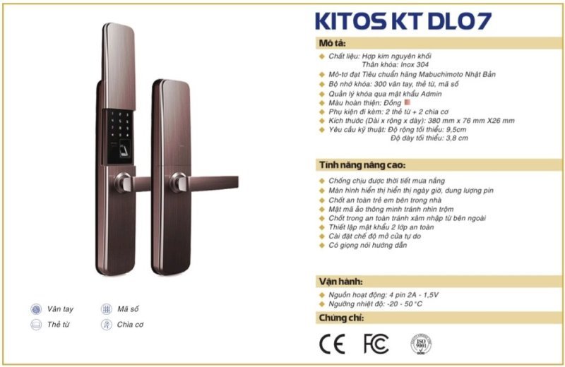 Kitos KT-DL07 được trang bị 4 phương thức mở khóa: vân tay, mã số, thẻ từ, chìa cơ. Cùng đầy đủ các tính năng cảnh báo và an toàn