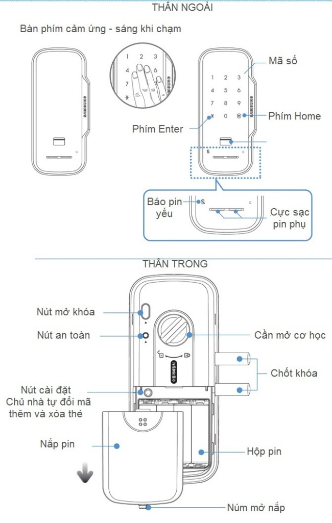 - Mở khóa bằng: thẻ từ, mã số. Có thể mua thêm phụ kiện để mở khóa qua điều khiển từ xa (remote), và kết nối với chuông hình