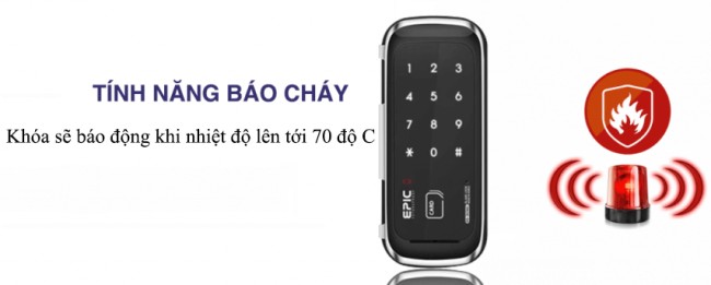 Epic ES 303G báo động khi nhiệt độ cháy trong phòng lên tới 70 độ C, khóa sẽ tự động mở cửa giúp người dùng thoát hiểm an toàn
