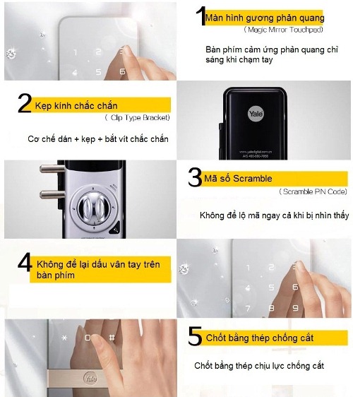 - Yale YDG313+ có các cách mở khóa: thẻ từ, mã số. Có thể lắp thêm phụ kiện để đóng mở khóa bằng điều khiển từ xa (remote control)