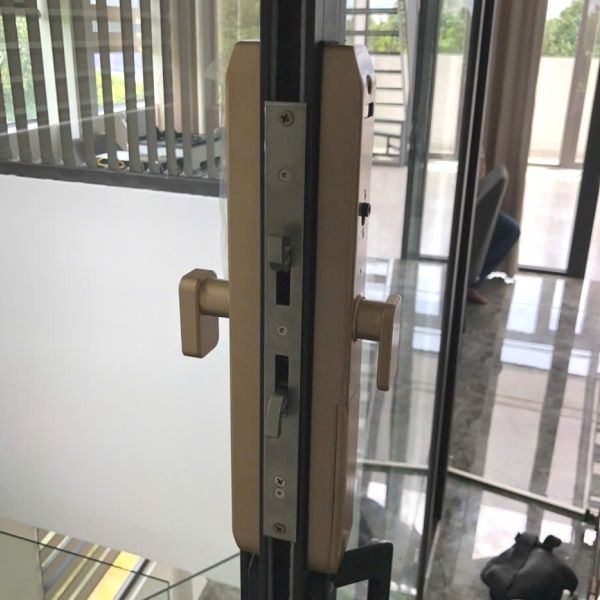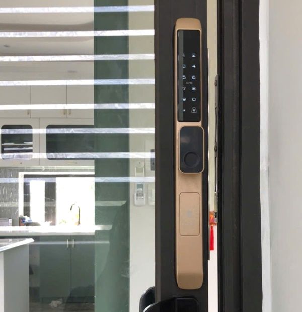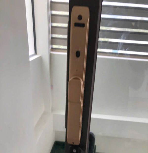 Khóa điện tử cho cửa nhôm, có mở bằng điện thoại. Chống được nước mưa. Màu vàng sâm panh
