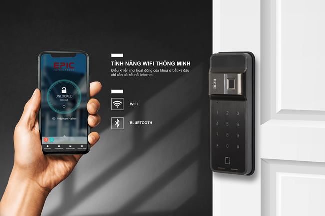 - Epic ES F500D có mở khóa bên ngoài bằng: vân tay, thẻ từ, mã số. Có thể lắp thêm phụ kiện để mở khóa bằng app mobile qua bluetooth hoặc wifi/ 4G, hoặc bằng điều khiển từ xa (remote)