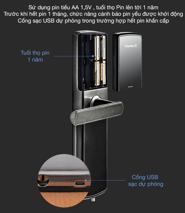 - Nguồn điện: 4 pin AA, dùng trong 1 năm; Nguồn điện khẩn cấp: sạc qua cổng micro USB (đấu bên ngoài trong trường hợp hết pin)