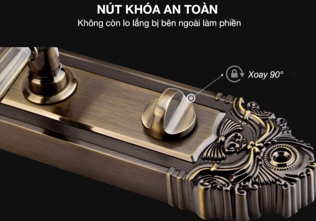- Có chốt an toàn cho trẻ nhỏ và chống làm phiền (khóa trái trong): khi xoay chốt này ở bên trong, khóa không thể mở được từ bên ngoài (chỉ mở được bằng chìa cơ) và trẻ nhỏ kéo tay gạt bên trong thì cũng không mở được để ra ngoài