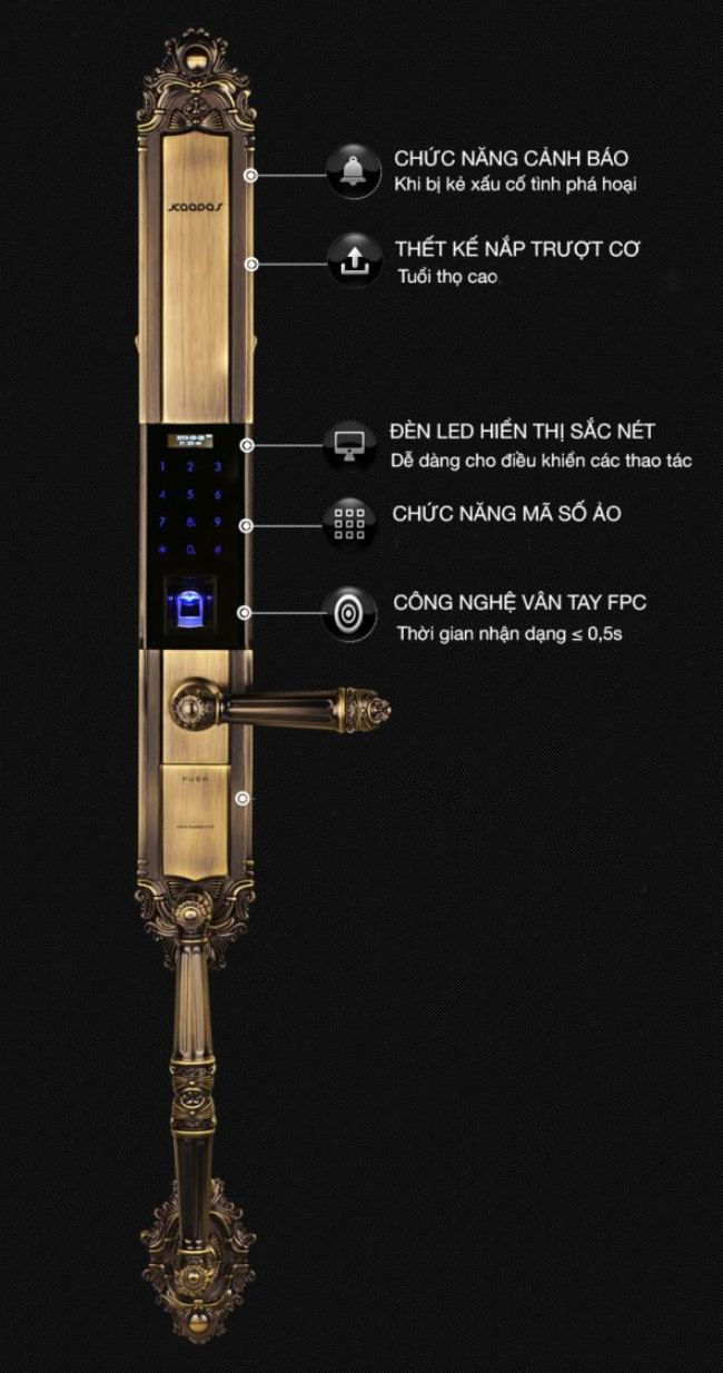 - Mở bằng: vân tay, thẻ từ, mã số, chìa cơ. Mở rộng: remote, bluetooth