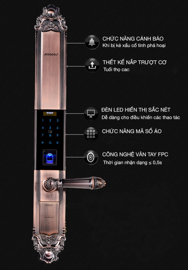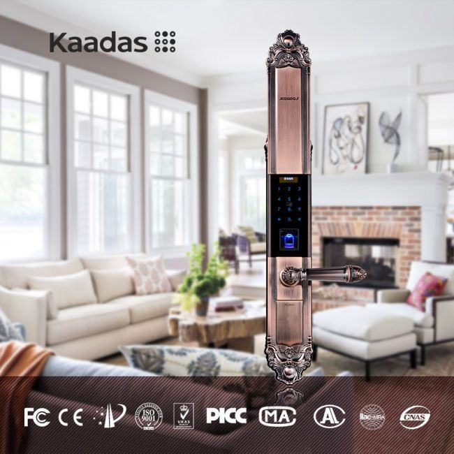Kaadas 6002 có kiểu dáng tân cổ điển, với 2 màu sắc sang trọng (đồng đỏ và đồng cổ) giúp tôn lên vẻ đẹp cho ngôi nhà kiểu biệt thự, bên cạnh các tính năng hiện đại của chiếc khóa điện tử cao cấp.
